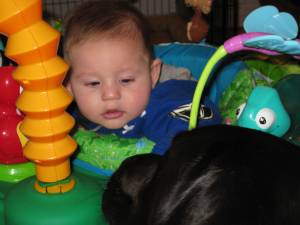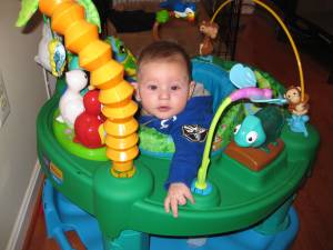 Now on Saturday our boy was hanging out in his ExerSaucer watching his first snowfall. He had spent a few minutes in it a few other times, but now he was happy hanging out and enjoying the afternoon checking out the sights and sounds of the rainforest (and Riley).