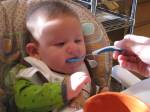 The biggest event of the week happened on Sunday though. Our boy has graduated to eating from something other than a bottle or a boob. The first time eating from a bowl – with a spoon – in his new high chair. I know… its almost too much to comprehend. It may not sound like much. In fact, if you would have asked me a year ago, I would have thought it wasn’t that big of a deal… However, it was a big deal to us yesterday. Watching him in what will be the first of many meals in his chair made me realize he is hitting some major milestones. The rice cereal was rather messy… and for his first feeding, the consistency didn’t look much different from regular milk. But to see him eating from a spoon was fun. We took just a “couple” of pictures..