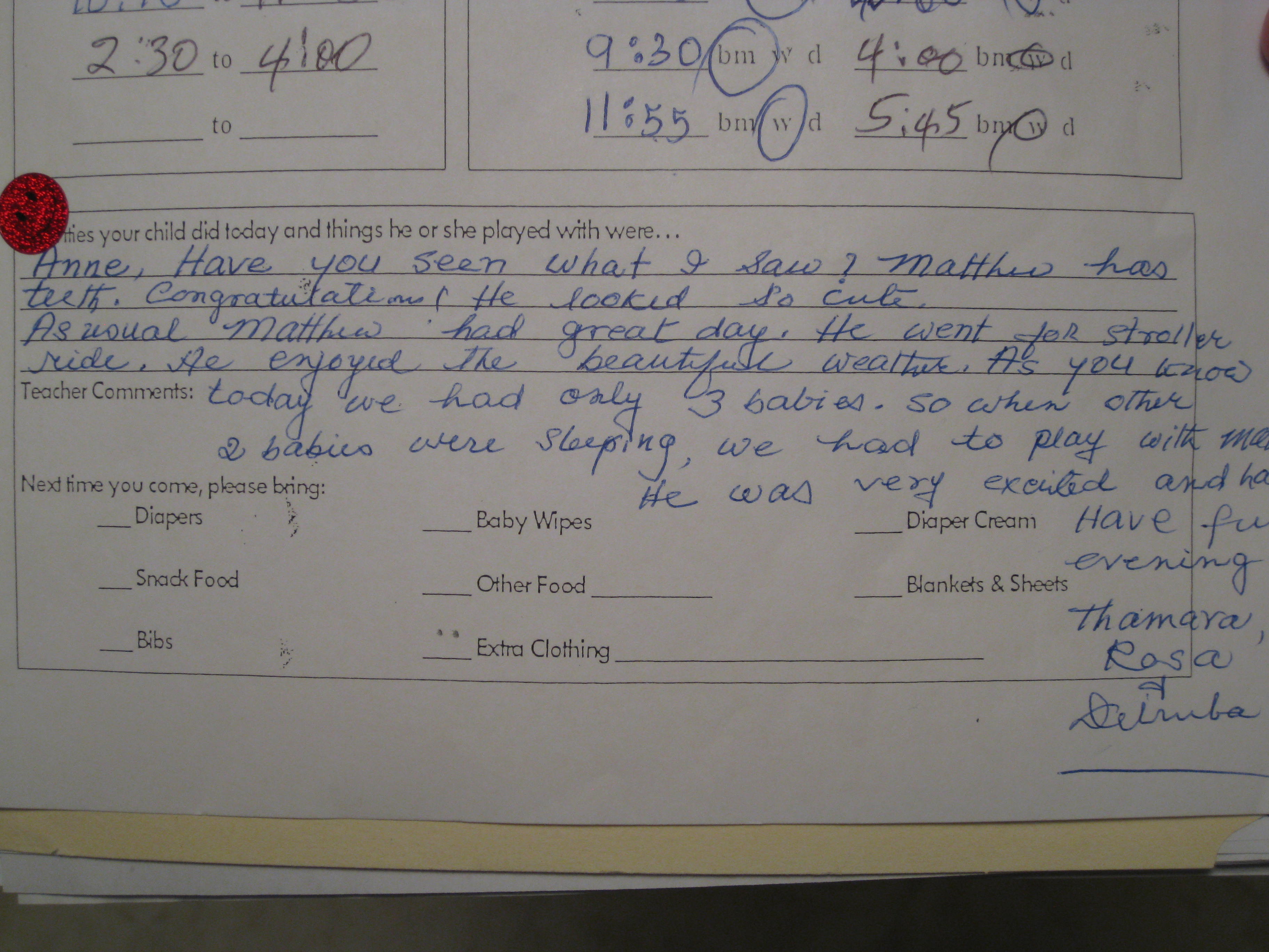 I’m thinking the ladies at day care may have been more excited than we were that Matthew had teeth coming thru.