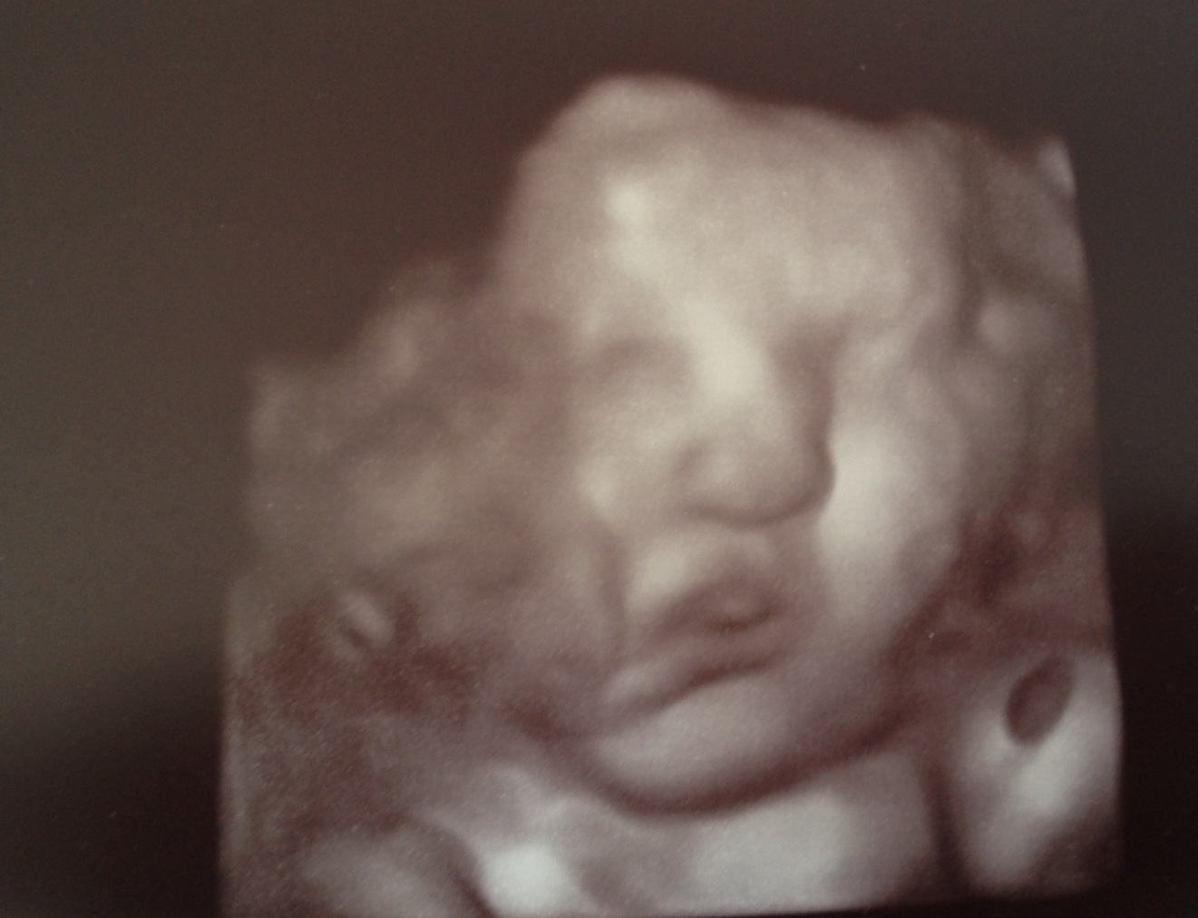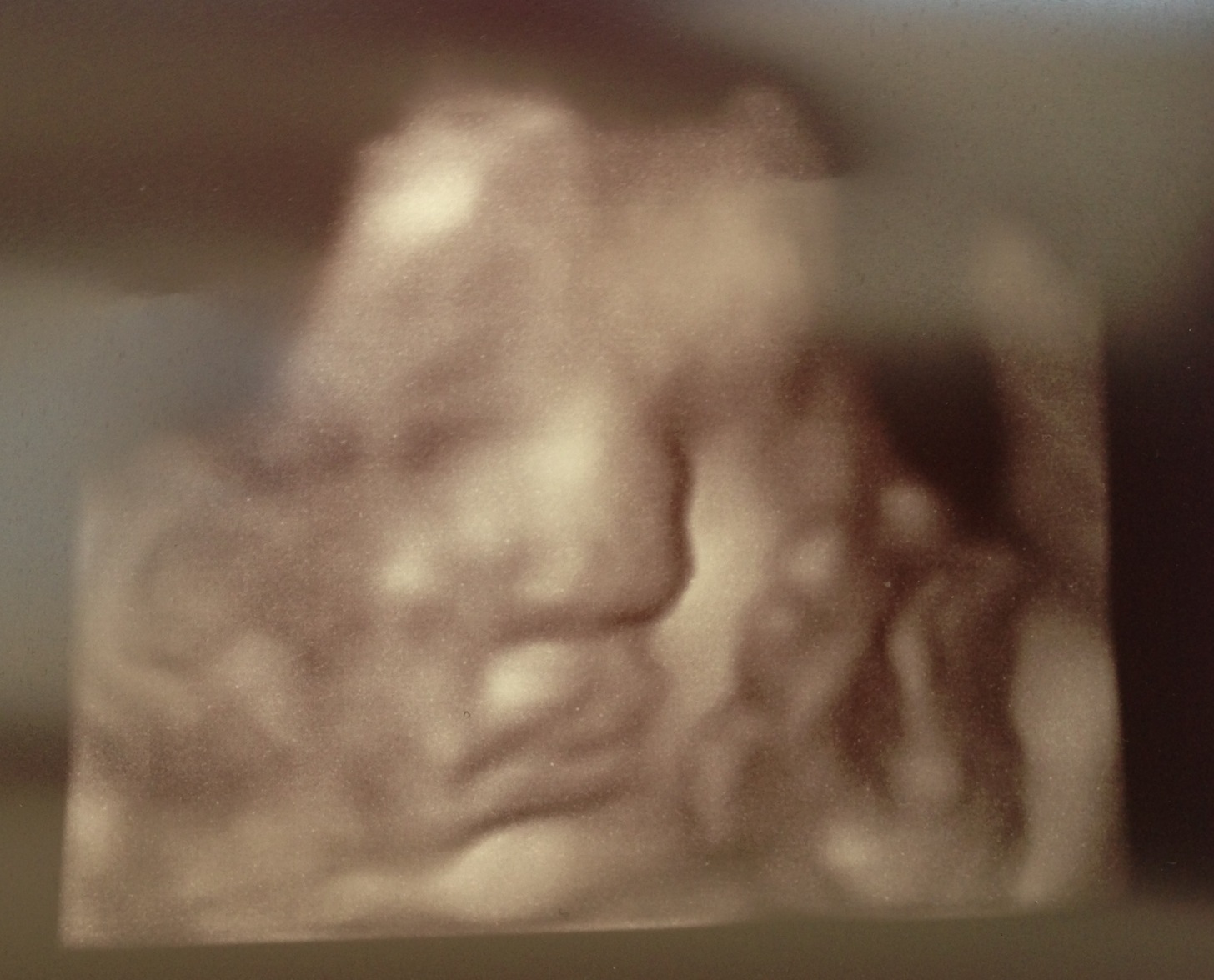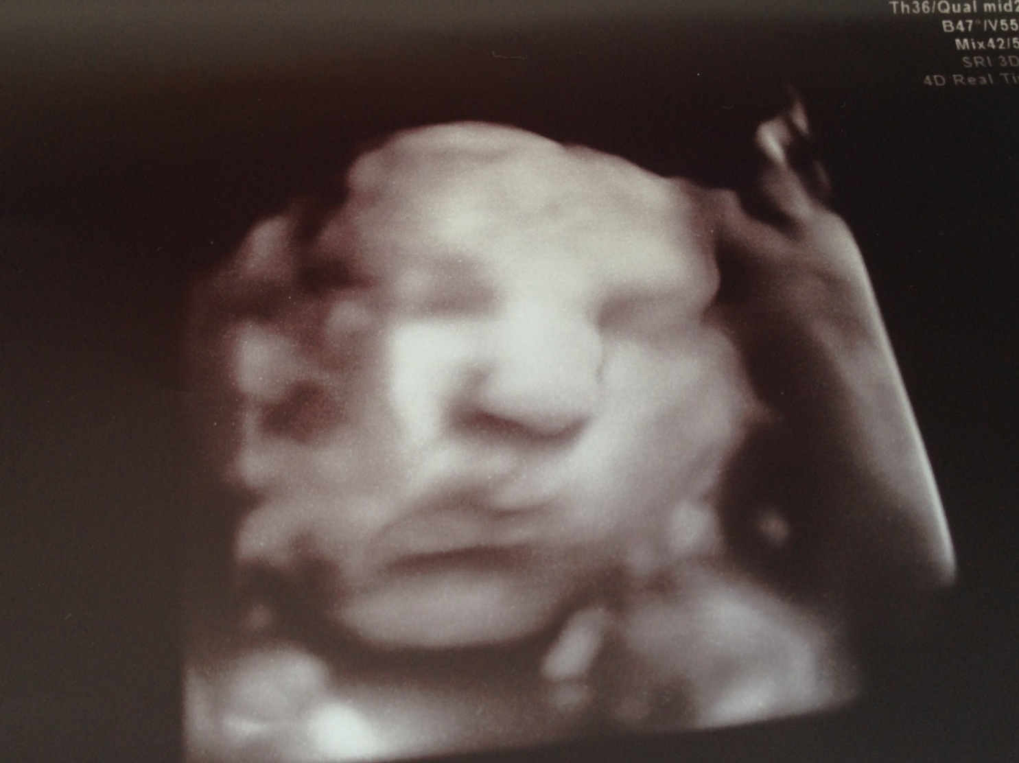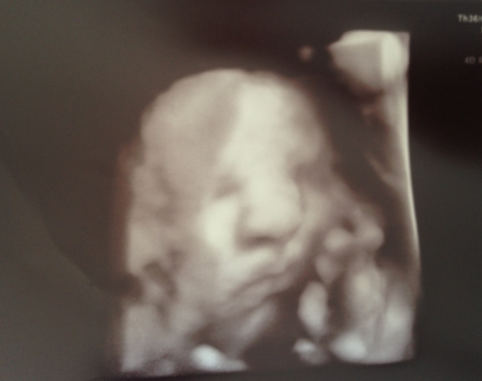 Yup, for every other visit when there was a chance to get a picture during the sonogram, she managed to turn away from the camera. But this week she came out of hiding and you can easily make out many of her features. (Don’t mind the placenta smooshing into her face)